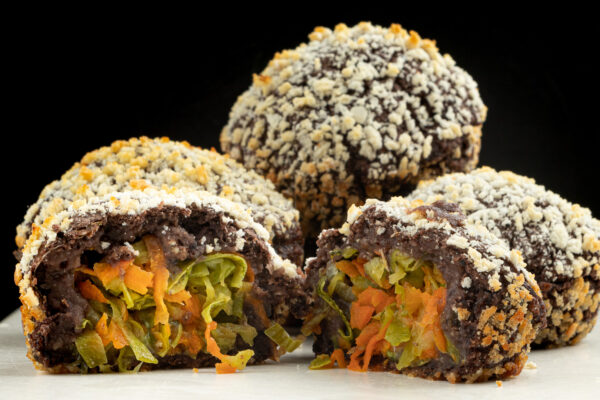 Bolinho de feijão crocante recheado abobrinha, cenoura e alho poró. Rico em proteína e muito saboroso para substituir a carne nas refeições. *Contém Glúten 6 unidades – 450g Contém Glúten