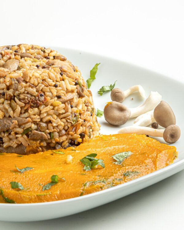 O carreteiro de shimeji orgânico é feito com arroz integral 10 grãos e abóbora cabotiá refogada com cebola. Uma refeição muito saborosa, vegana e nutritiva.